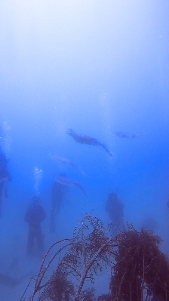 前日に大雨が降っていた影響でやや濁り気味の海中。でも透明度なんて関係ない!水中の地形を活かした横穴で探検気分を味わいながら、みんなで楽しく潜れました😊