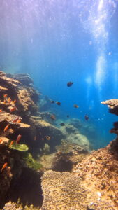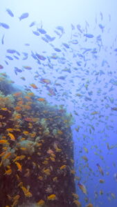 キンギョハナダイの群れが圧倒的な数で出迎えてくれて、水中はカラフルでにぎやか♪